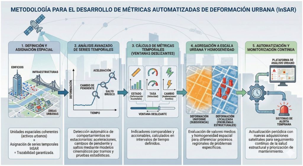 La tecnología InSAR permite medir desplazamientos milimétricos del terreno y de las estructuras sin necesidad de instalar sensores en el terreno, cubriendo ciudades completas de forma homogénea y con información histórica de varios años. Sobre esta base, UrbanEye ha desarrollado métodos automáticos para analizar la evolución temporal de la deformación, identificar aceleraciones o cambios de comportamiento y transformar esa información compleja en métricas simples y comparables de salud estructural.