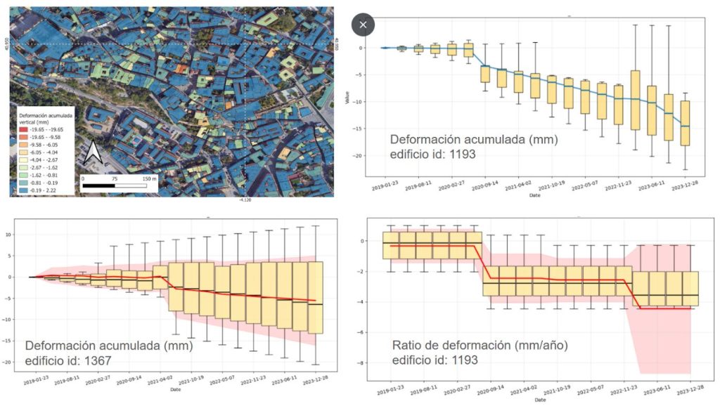 Uno de los principales avances del proyecto ha sido el desarrollo de métricas que describen cómo evoluciona cada edificio o infraestructura en el tiempo, incluyendo la deformación acumulada, la velocidad de deformación y la existencia de deformaciones diferenciales dentro de un mismo elemento. Estas métricas permiten pasar de la observación puntual de datos satelitales a una visión clara y operativa del estado estructural urbano.El sistema se ha validado mediante dos casos de uso reales y complementarios. En Lorca, una de las zonas con mayor subsidencia asociada a la sobreexplotación de acuíferos en Europa, UrbanEye ha permitido identificar áreas y edificios con mayores tasas de deformación y analizar su evolución en el tiempo. En Segovia, ciudad con alto valor patrimonial y problemáticas geotécnicas localizadas, el sistema ha demostrado su capacidad para detectar aceleraciones y deformaciones diferenciales en edificios concretos, clave para la gestión preventiva del riesgo.